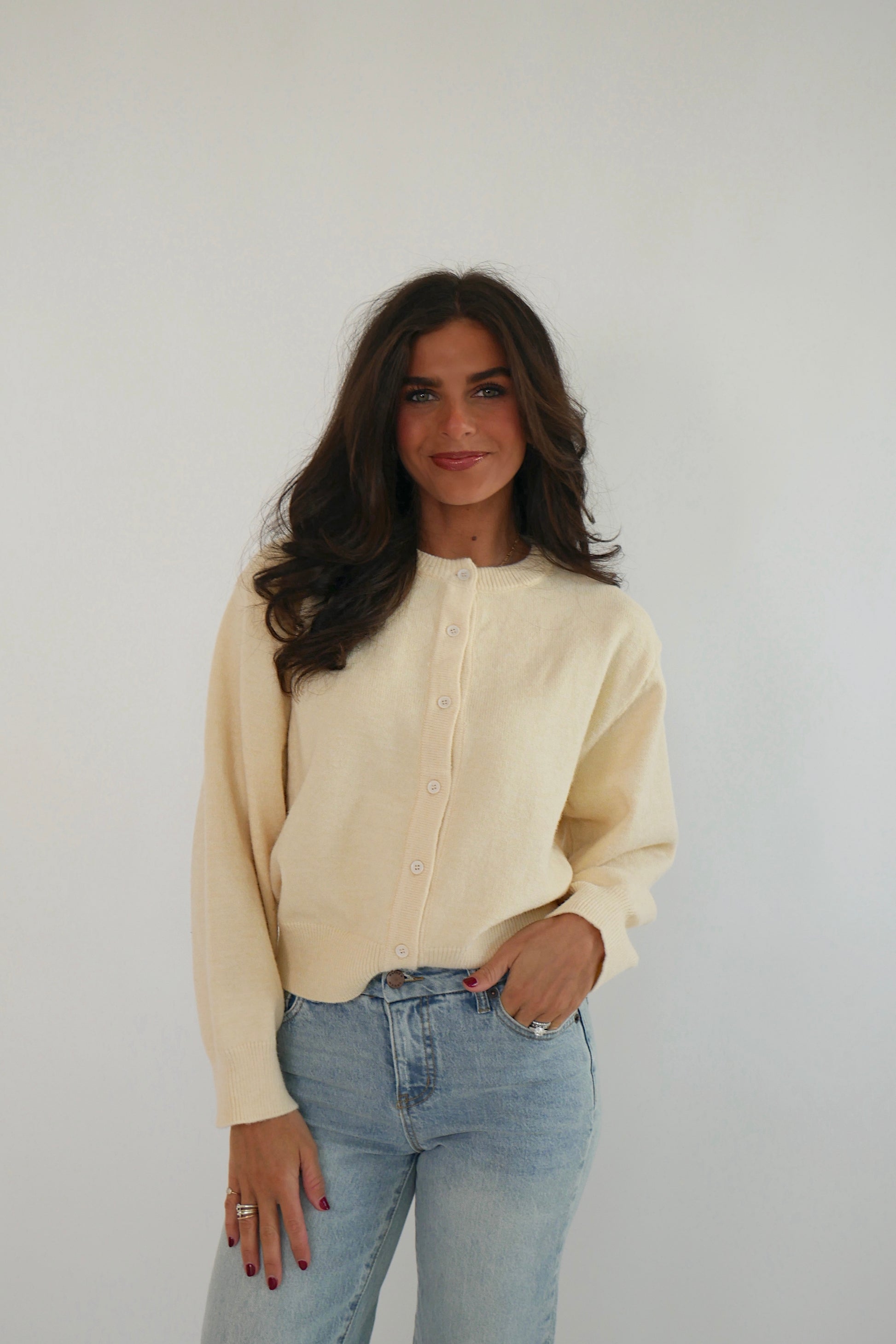 A timeless, cozy cardigan crafted for effortless elegance. Soft to the touch with a refined drape, it blends classic design with a luxurious feel, making it a versatile staple for polished everyday wear.