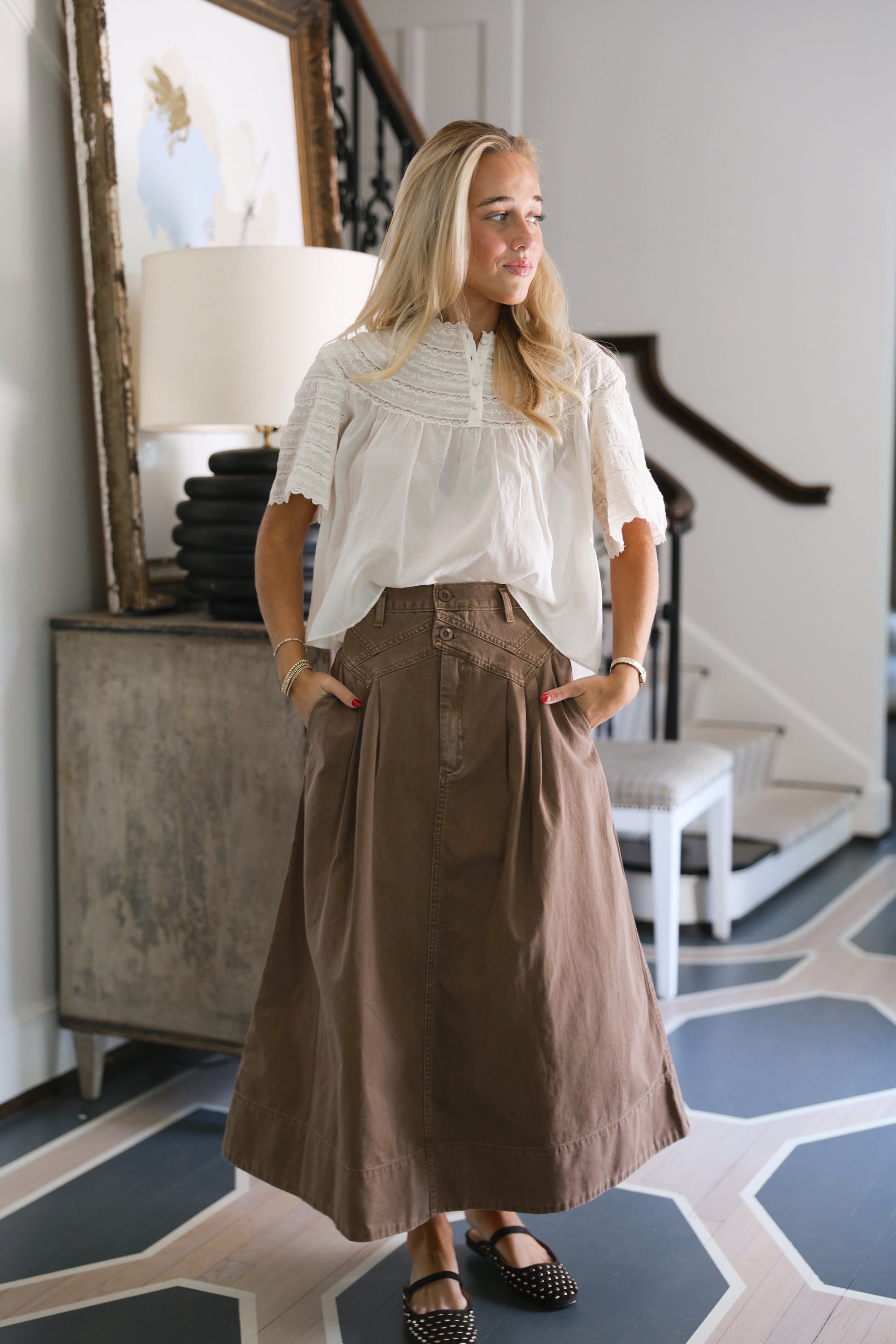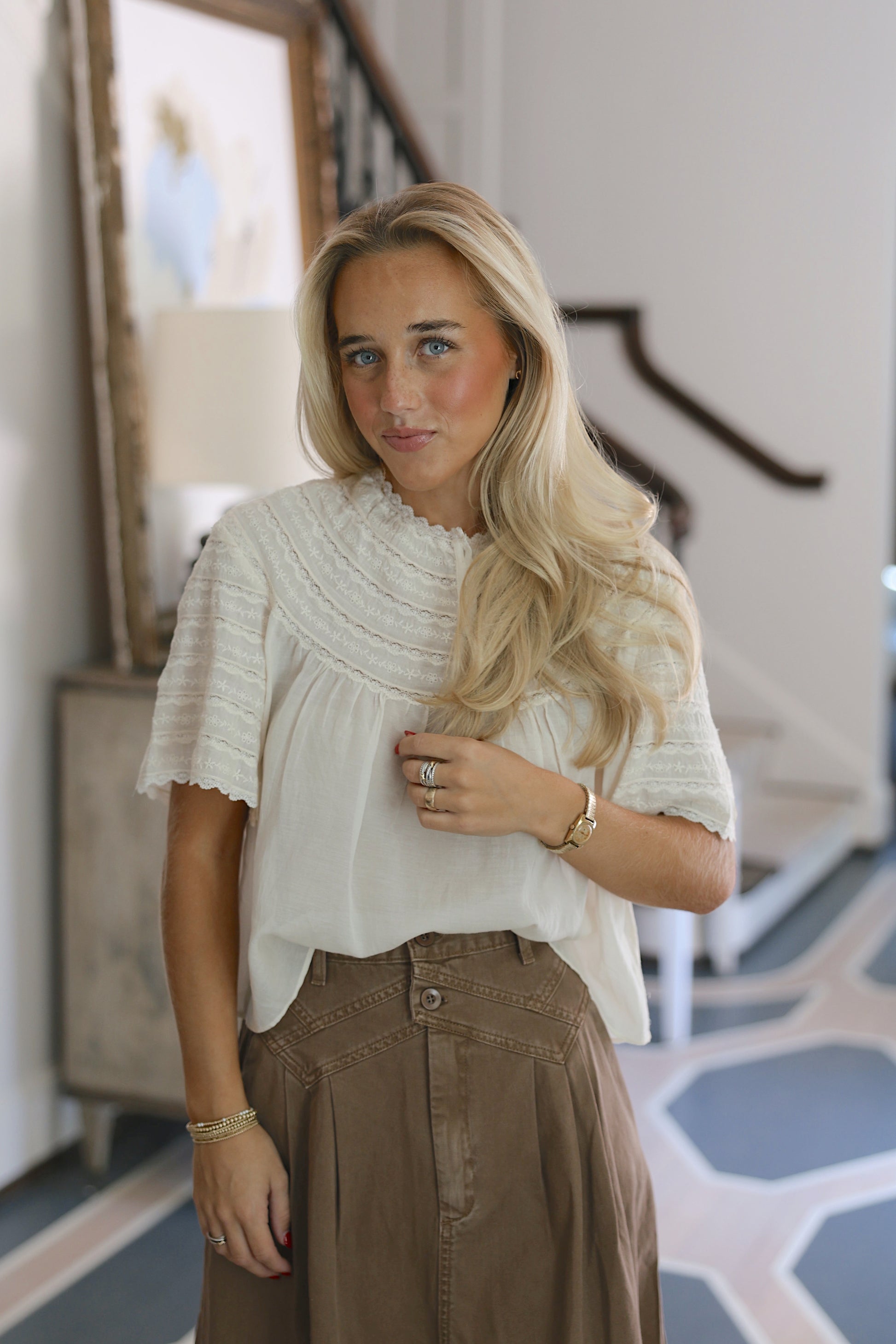 The Katrina Top is the perfect blend of sweetness and ease, featuring delicate lace paneling, scalloped edges, and soft gathers.