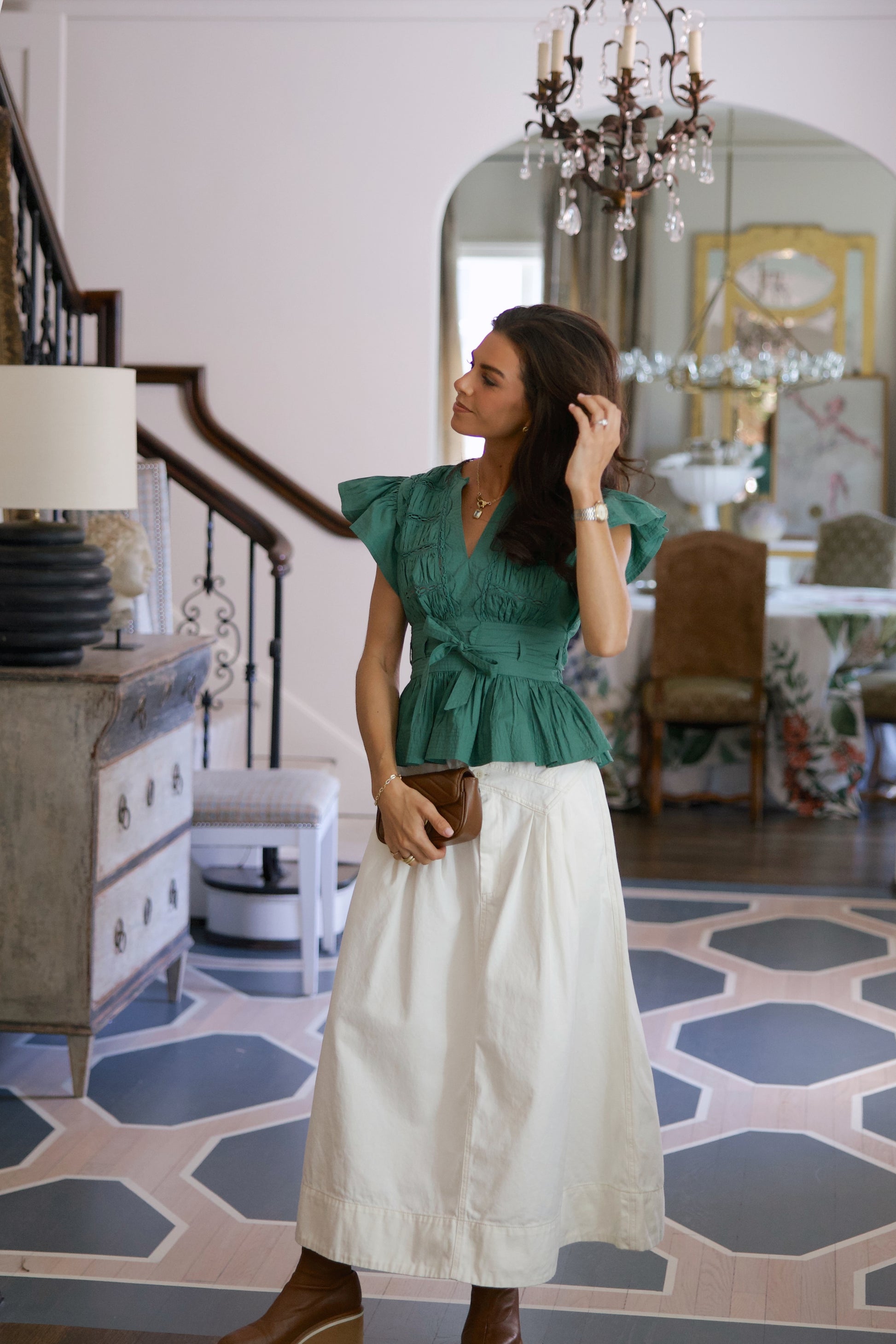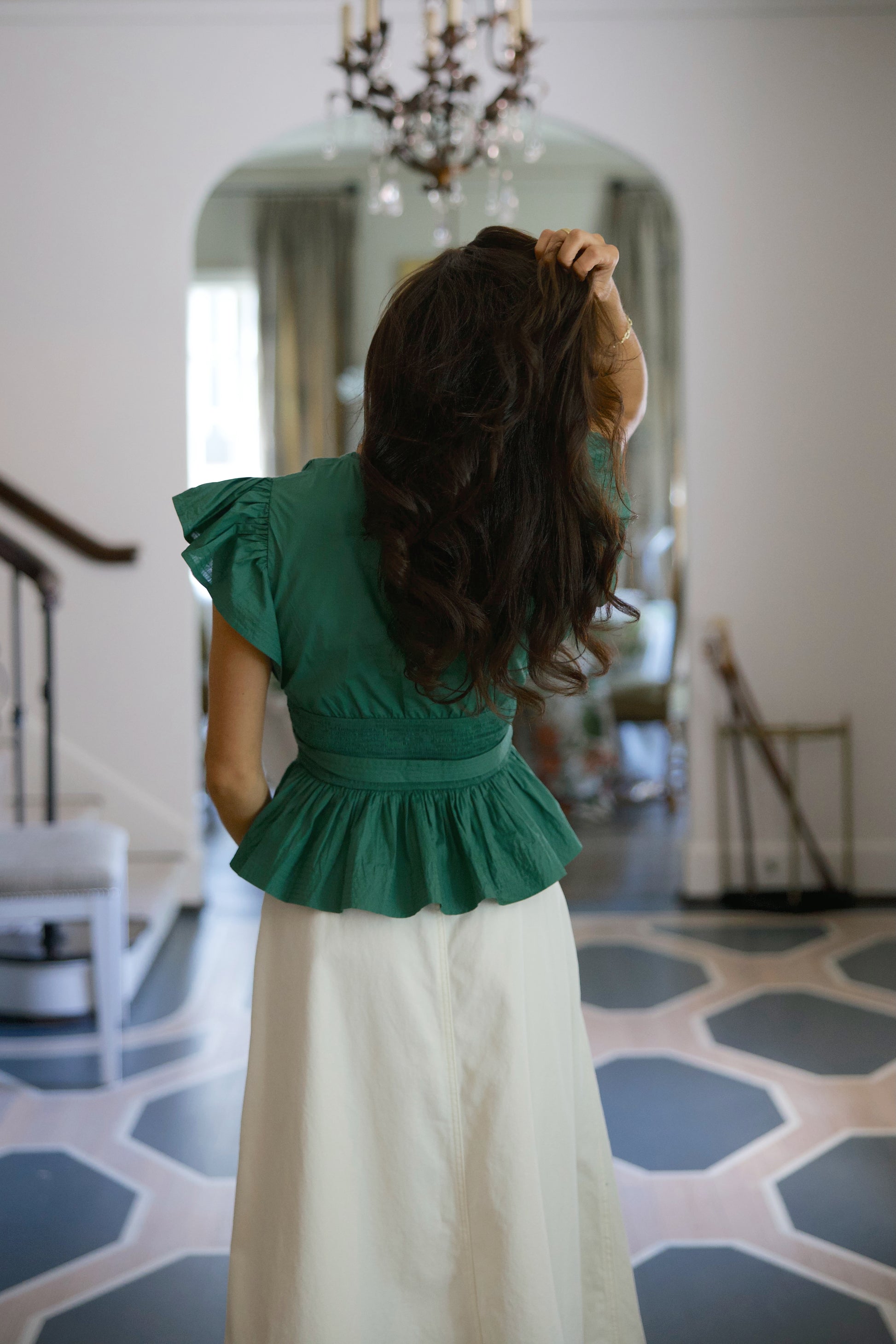 The Madelyn Top in Foliage Green is filled with intricate details of gathers, pintucks, and lace trim. Finished with flutter sleeves and a peplum hem for a cinched yet feminine silhouette.