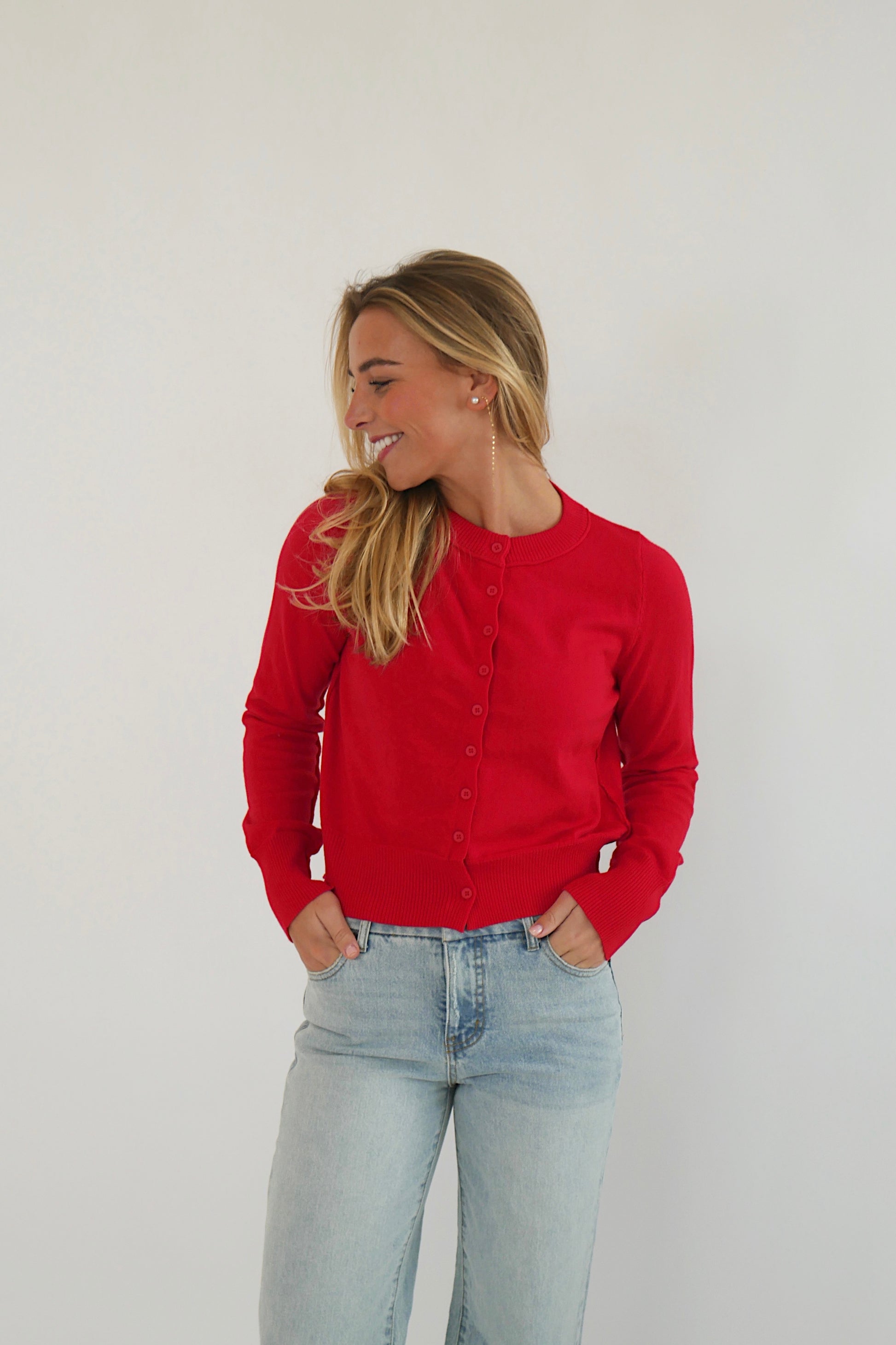 A luxuriously soft cardigan in a rich red hue, designed for effortless elegance. Features long sleeves, a smooth, cozy feel, and a flattering relaxed fit. Perfect for layering over casual or dressy looks for added warmth and refined style.