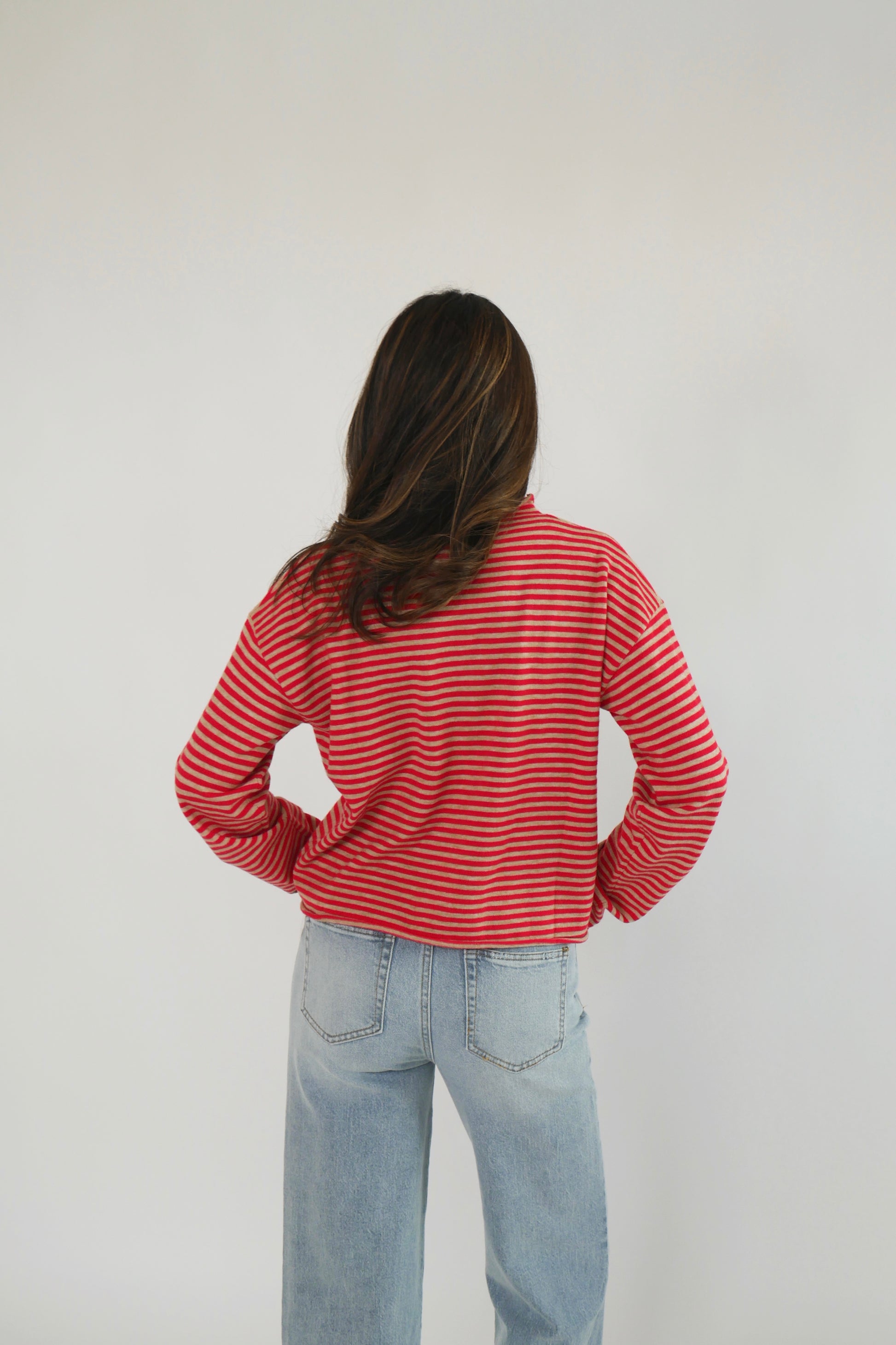 A perfect balance of comfort and style — this mock neck sweater features red and grey tones in a subtly striped design. Made from the softest, buttery knit, it drapes beautifully while keeping you snug. Whether layered under a coat or worn on its own, it’s a go-to piece for relaxed sophistication.