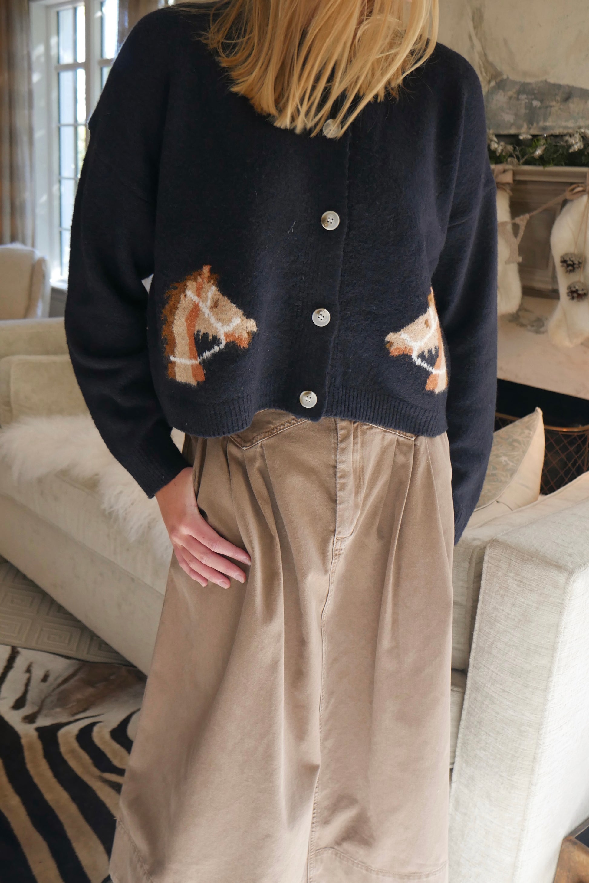Embrace equestrian charm with this playful cropped cardigan featuring adorable horse motifs and classic button-front styling. Perfect for western-inspired looks, this cozy knit sweater offers both style and comfort with its ribbed trim details and versatile design.